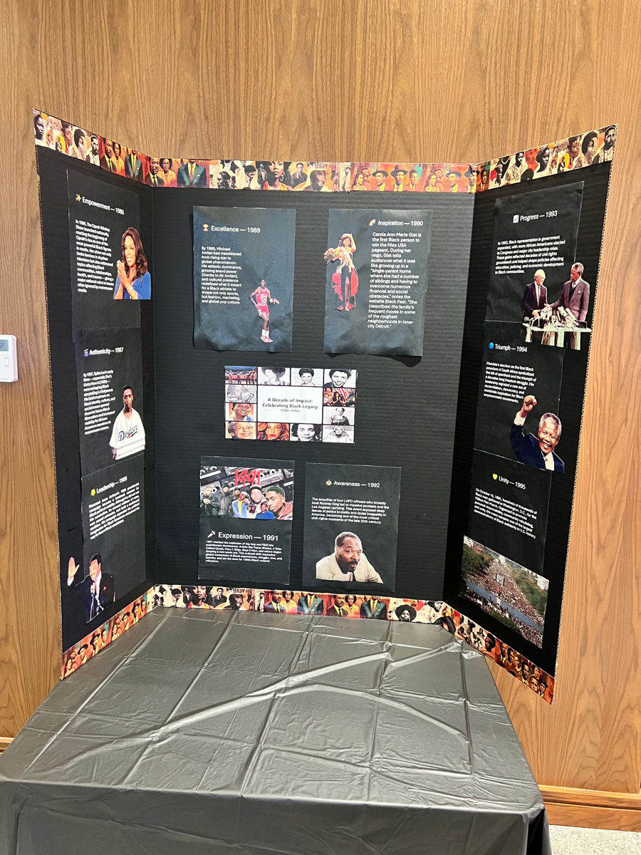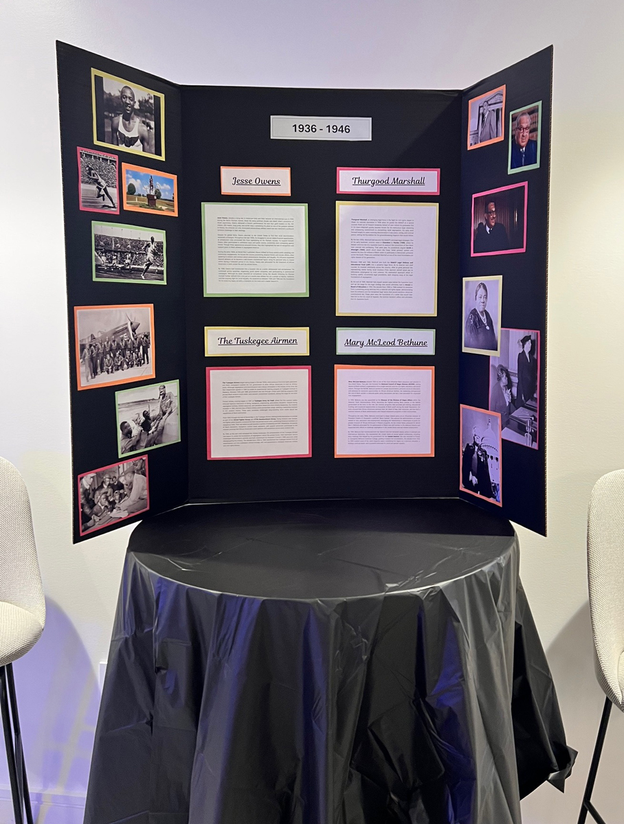 After FirstCall and a unified reading of “Still I Rise” by Maya Angelou by a small group of associates we kicked off our event. The activation included decade‑themed boards designed by members of our Engagement Committee. Each member selected a decade from the past 100 years (1926-2026) and dedicated their board to milestone moments in culture and innovation from that era spotlighting influential leaders, groundbreaking achievements, and cultural movements that helped define the decade.