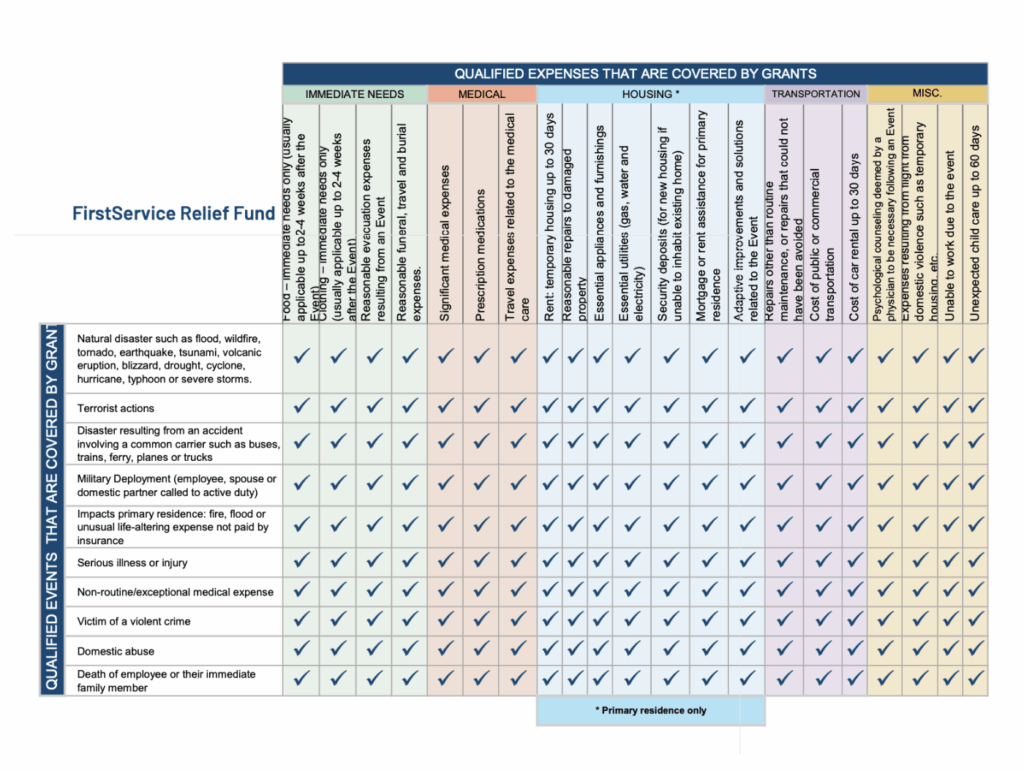 The Relief Fund can provide financial grant assistance to employees of FirstService companies, FirstService subsidiaries and their franchisees, and employees of those franchisees in the U.S. or Canada who meet the criteria for suffering from a hardship Qualified Event and have incurred Qualified Expenses as a result.