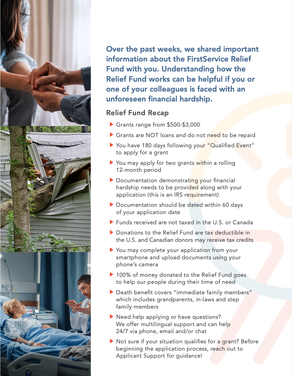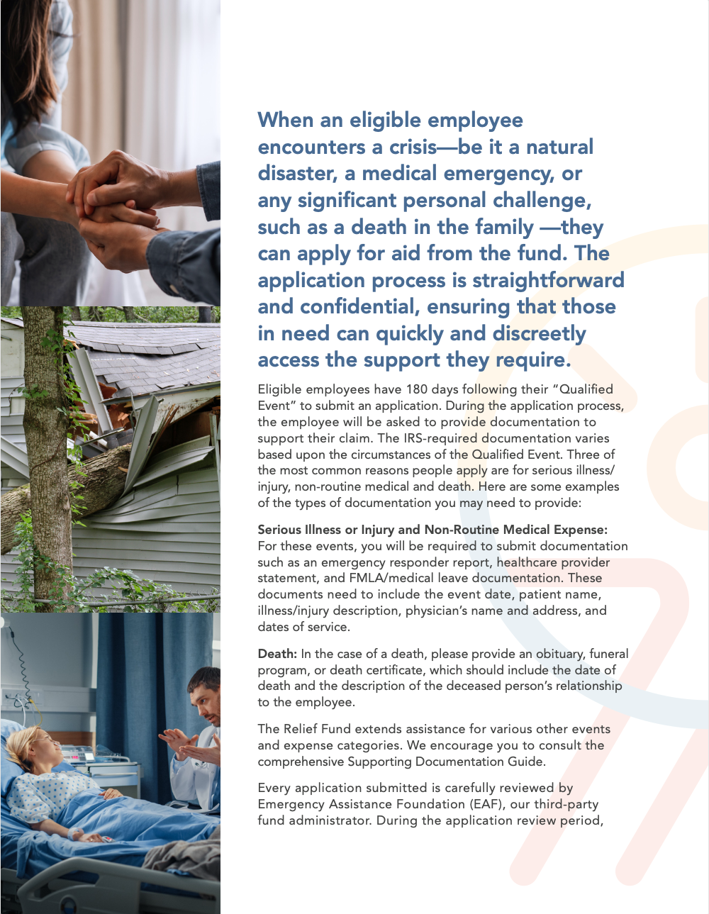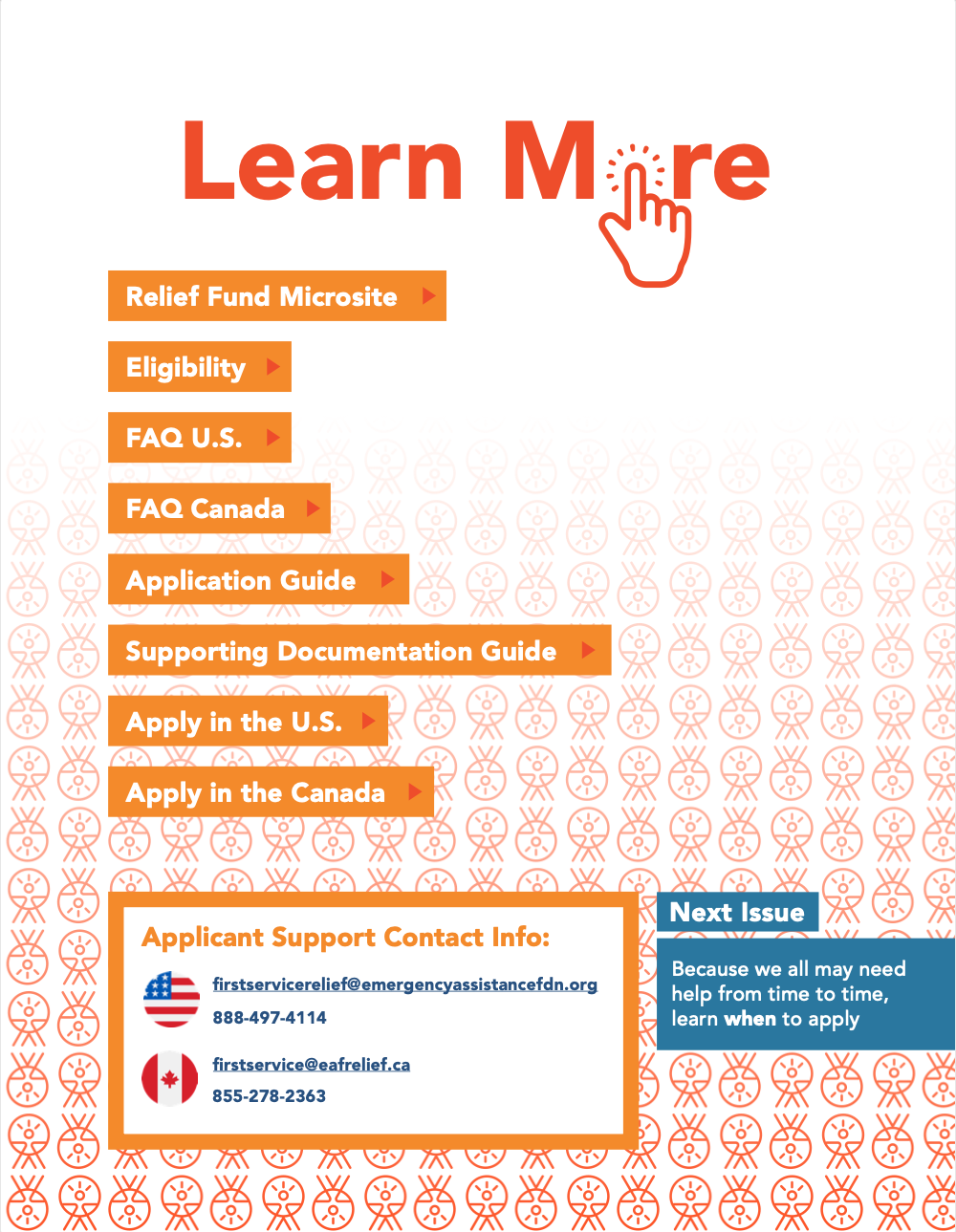We invite you to visit the pages of this site to learn more about how to get and give help through the Relief Fund. If you have any questions or if you’d like to speak with someone about the Relief Fund, please contact the Emergency Assistance Foundation support team via email or by phone at: